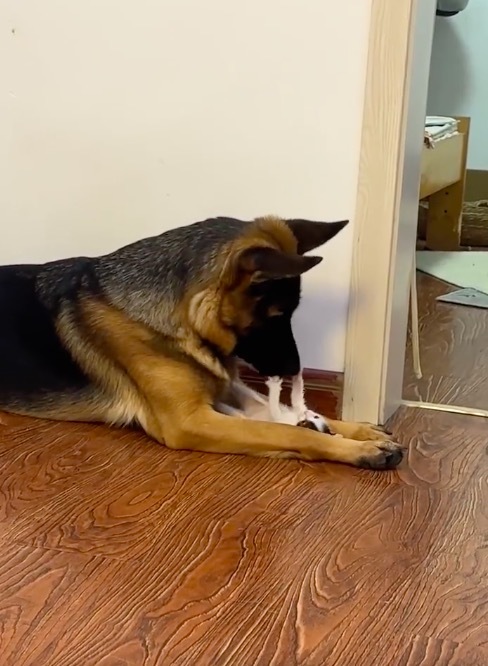 小猫将德牧当作“保暖垫”蜷缩入睡,德牧保持静止避免惊扰;幼猫在德牧身上跳跃嬉戏,德牧仅用爪子轻按调皮的猫示意分寸。