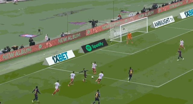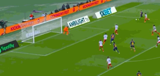 伤停补时第3分钟,弗伦基德容传中,罗纳德阿劳霍抢点推射远角破门。巴萨2比1完成绝杀。
